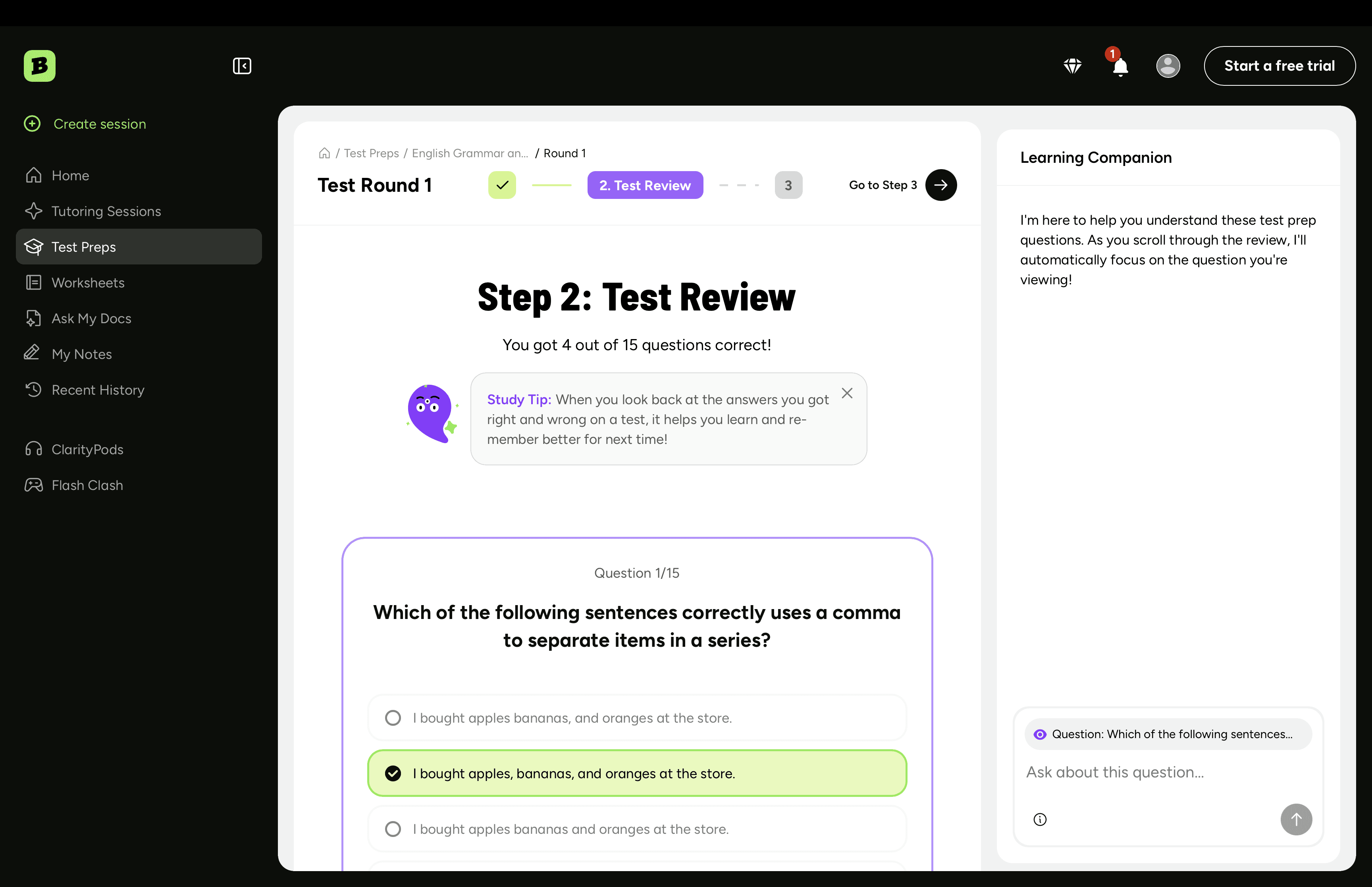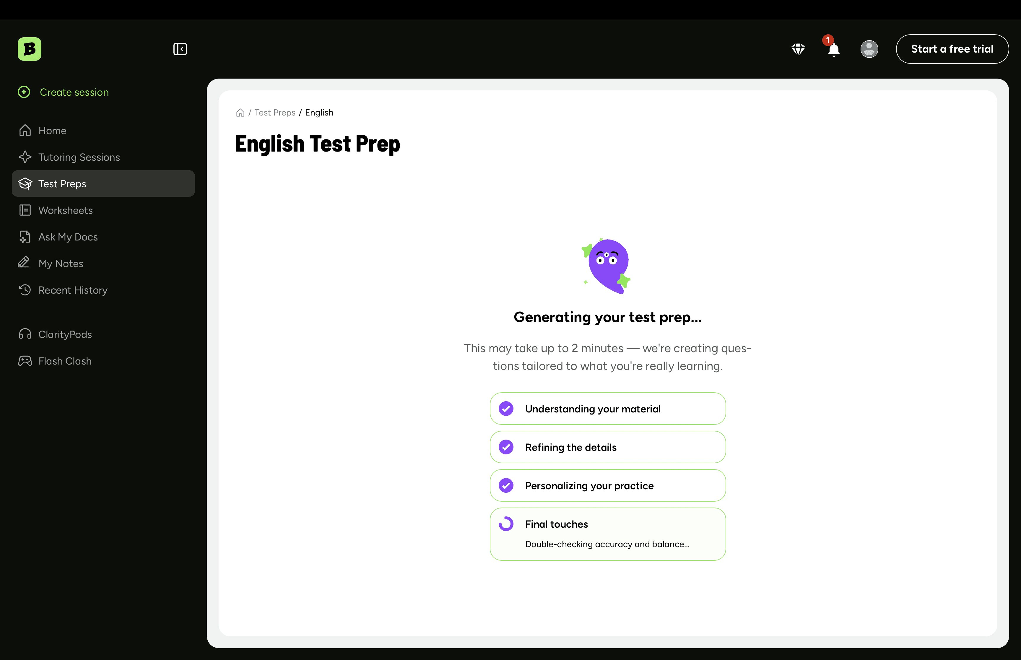 Homework done in Brainly → tap "Add to Test Prep" → pick exam date → AI generates study plan + practice questions → daily nudges scheduled around the student's school calendar → performance feeds the next session (wrong answers come back harder, mastered topics space out).