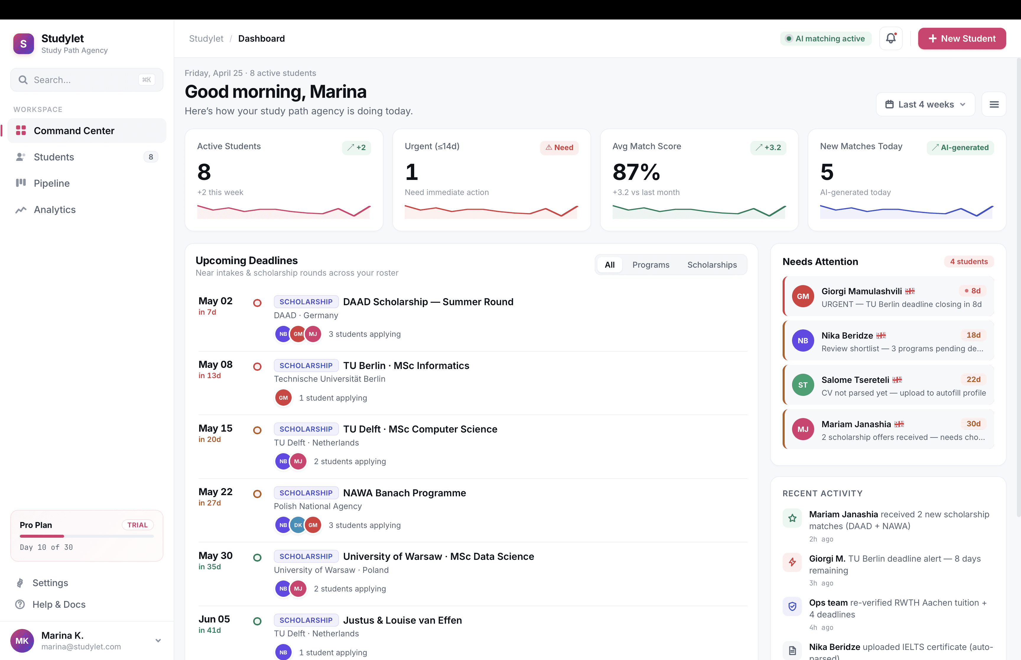 Study agencies handle thousands of programs across hundreds of universities. In 2020, agents tracked it all in Excel and bookmarks. Tuition, deadlines, scholarship eligibility, document requirements, all of it scattered across university websites, all of it changing constantly. A typical agent juggles 40 to 80 active students. They lose deals to stale data and miss deadlines that cost them referral chains.