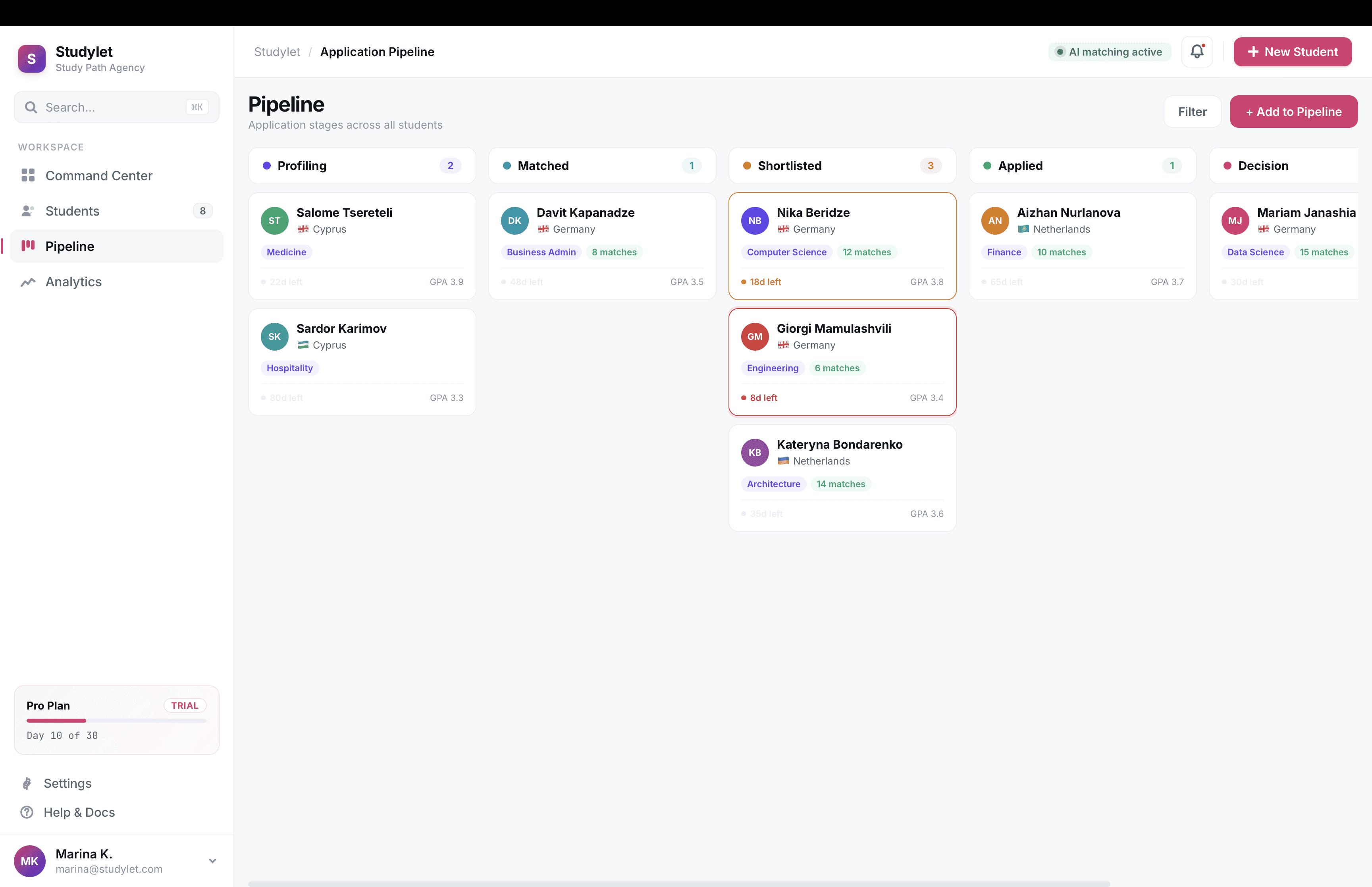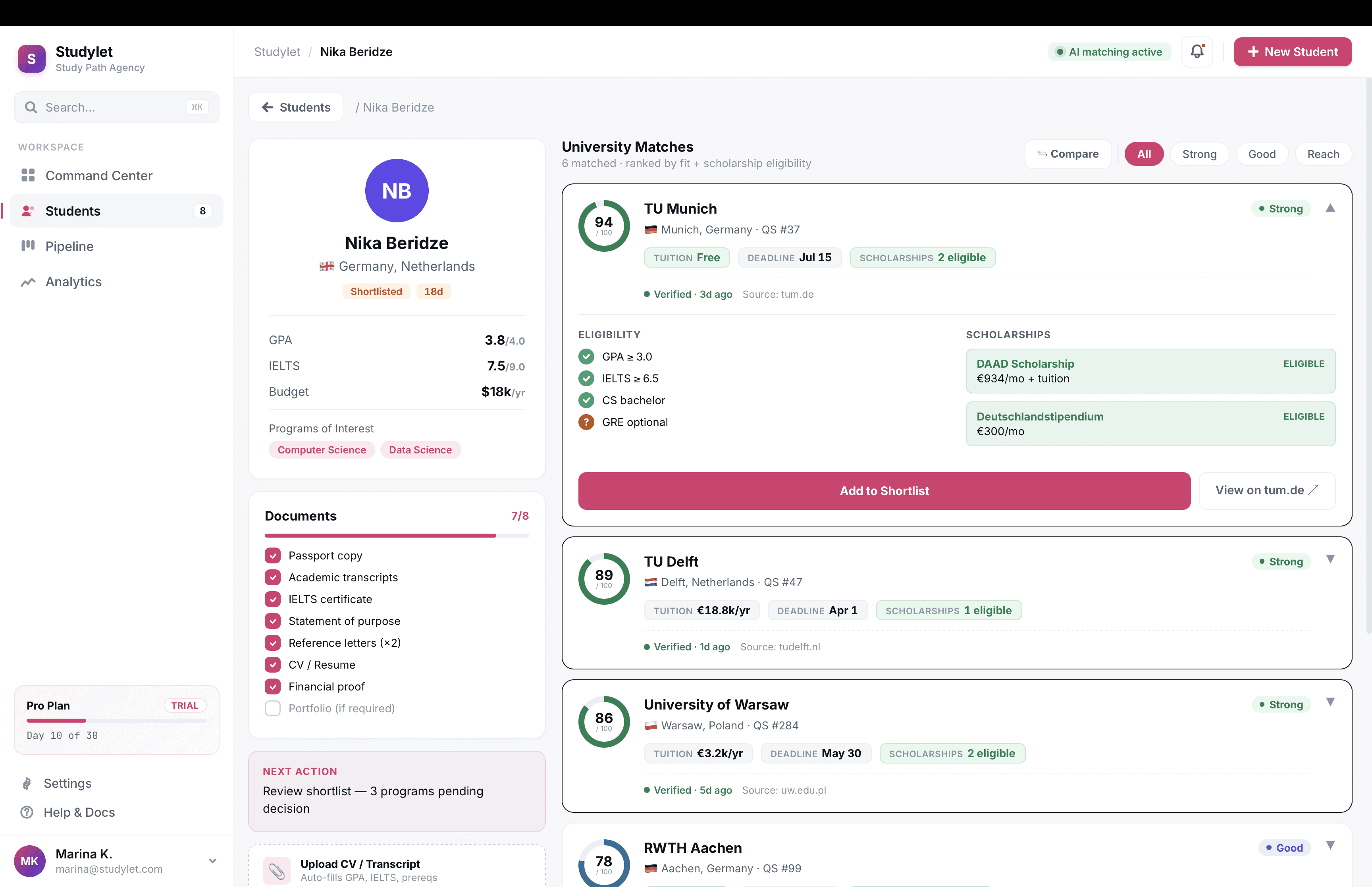 Student profiles. Structured records holding test scores, budget, preferences, documents. Once profiles existed, agents could filter the database against a saved student in one click. This was the design unlock. Average shortlist time fell hard the week we shipped it.